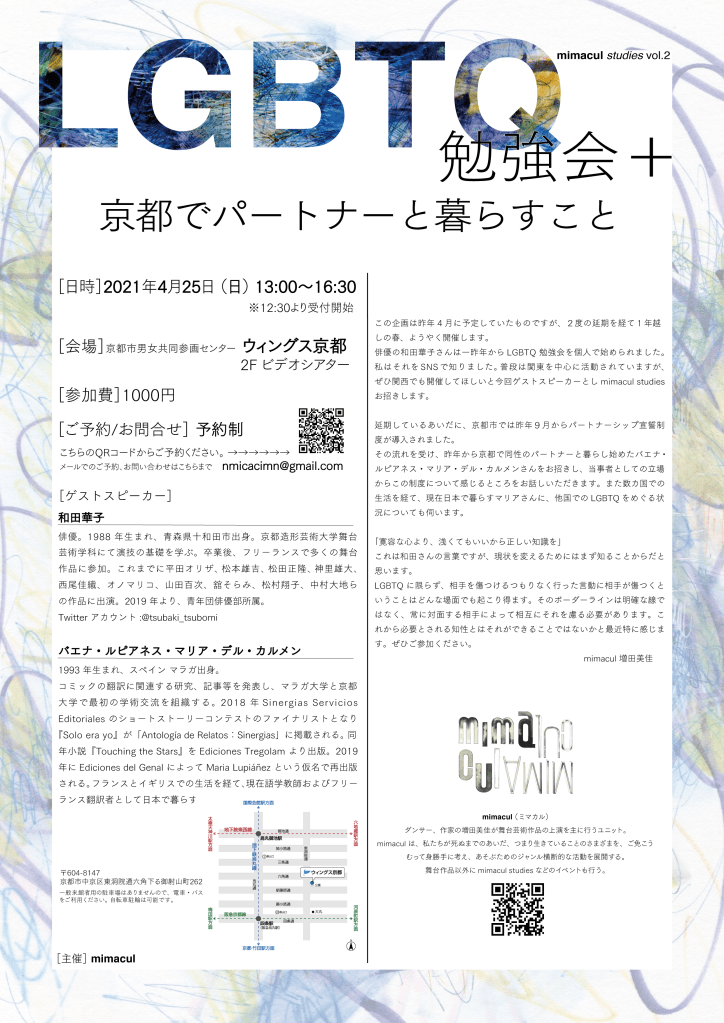 この企画は昨年4月に予定していたものですが、2度の延期を経て1年越しの春、ようやく開催します。俳優の和田華子さんは一昨年からLGBTQ 勉強会を個人で始められました。私はそれをSNSで知りました。普段は関東を中心に活動されていますが、ぜひ関西でも開催してほしいと今回ゲストスピーカーとしmimacul studiesお招きします。